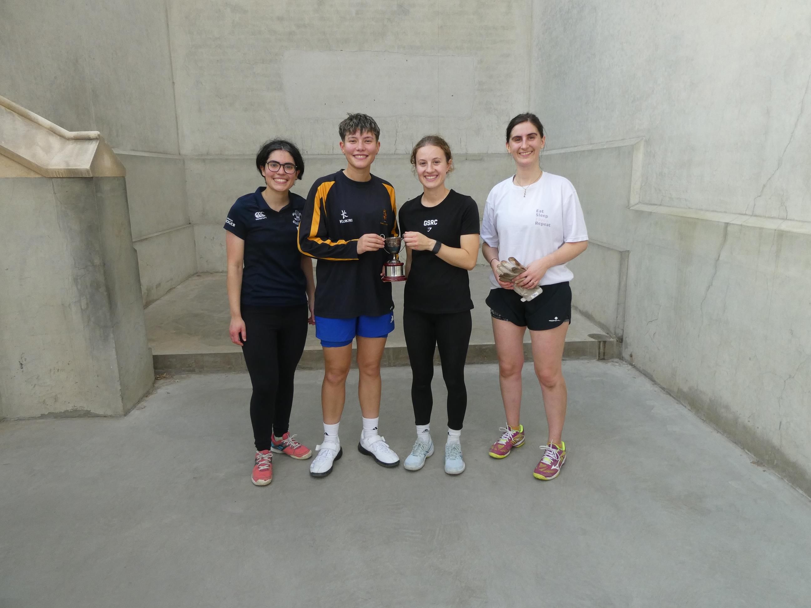 The results leading up to the final suggested that Freya & Zoe would have their work cut out against Issy & Bethan, but the Berkhamsted pair are experienced players and immediately showed that they were in the contest, taking an early lead and posing Issy & Bethan problems that they hadn't yet had to deal with, especially at the set piece which had hitherto been one way traffic for them. The first game produced some outstanding Fives with the four players all offering different things - Freya returning cut well and controlling things on top step, Zoe volleying with plenty of attacking intent but also a good measure of accuracy, Issy cutting hard and hurtling around the court and Bethan demonstrating her trademark ambidexterity and placement, while never once looking hurried. With the score at 8-8, it was all to play for but it was at this point that the combination of power and control in the Wong/Miles partnership began to tell and they seized the game by the scruff of the neck, moving ahead decisively to take it 12-8. They never looked back from that point on, and while Freya & Zoe continued to play some good quality Fives, they weren't able to exert the same pressure in the second game as they had in the first, allowing Issy & Bethan to sweep out to a 12-5 win and to claim the title. It was a real treat watching these two talented players play again and they were deserving winners - we very much hope we get to see them both on court again before too long!
