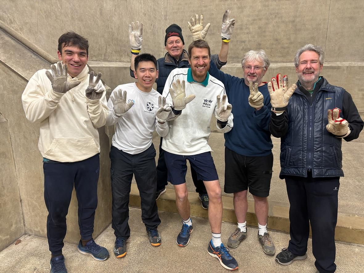 The awkwardly numbered seven players mixed and matched with foot at 7 to ensure those not on court didn’t freeze. Pictured with hands in the five and two position are (l-r) Frankie Manderson-Harkin, Jamie Lai, Graham Pulsford, Simon Randall, David Ingram and Paul Kendall.